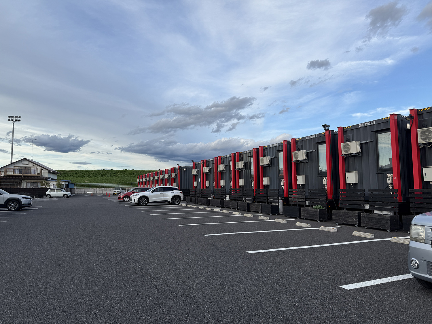 よく見るとコンテナごとにタイヤとナンバープレートが付いていたので、厳密には建物ではなく移動可能な車両という扱いのようです。きっと何かしら営業上のメリットがあるんでしょう(詳しい法律は分かりませんが、不動産取得税とか固定資産税がかからない、みたいな)。